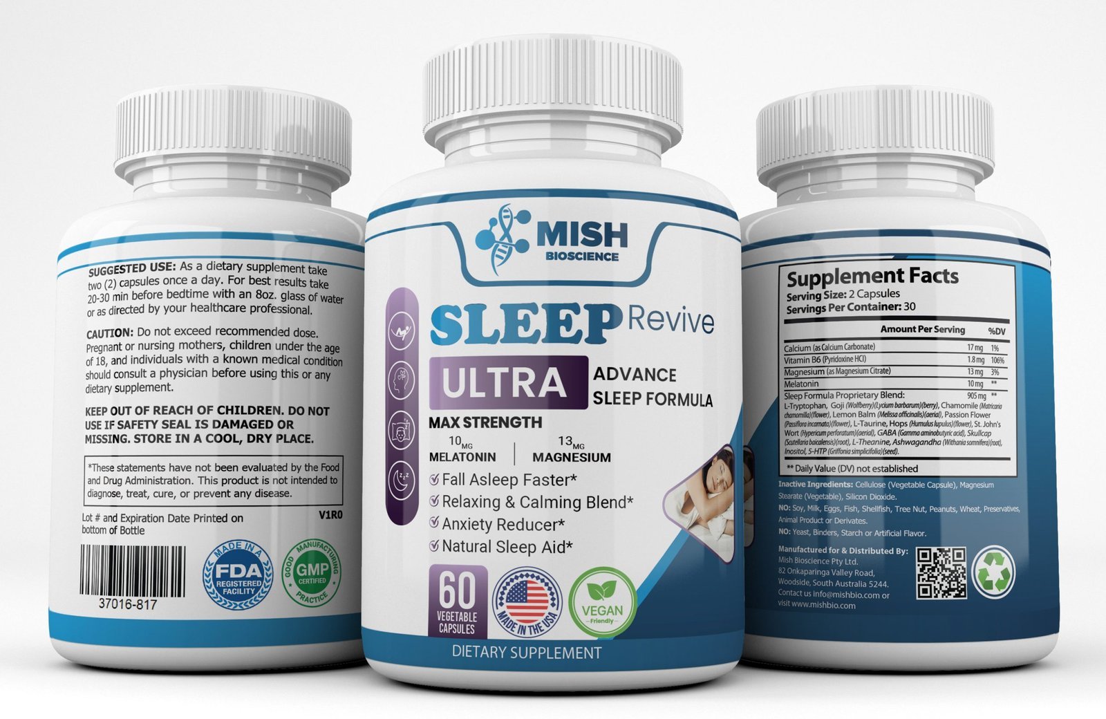 A Comprehensive Sleep Solution: Mish Bioscience’s Sleep Revive Formula takes a holistic approach to sleep health. By synergistically combining these ingredients, it addresses not only the physiological aspects of sleep regulation but also provides emotional and mental support, reducing stress and anxiety. This comprehensive blend aims to provide a holistic solution to achieving restful and rejuvenating sleep.